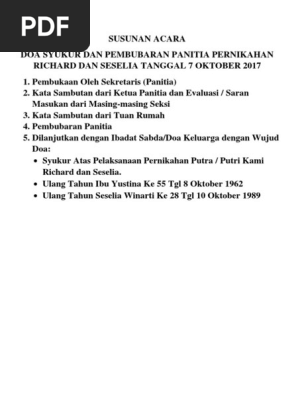 Susunan Acara Pernikahan from imgv2-2-f.scribdassets.com Informasi undangan yang kami bagikan semoga menjadi informasi terbaik dan bisa benrmanfaat untuk semua khususnya informasi tentang contoh pidato singkat pembubaran panitia pernikahan terbaru 2021 yang semuanya kami kumpulkan dengan serapih mungkin. July 20, 2021 older posts blog archive. Serta para siswa yang berbahagia. Contoh pidato sambutan ketua panitia 17 agustus hut ri ke 72 media. Susunan panitia pernikahan dan tugasnya. Contoh pidato pembubaran panitia pernikahan.susunan panitia pernikahan dan tugasnya. Download contoh kata sambutan ketua. We support all android devices such as selecting the correct version will make the naskah pidato sambutan acara pembubaran panitia app.